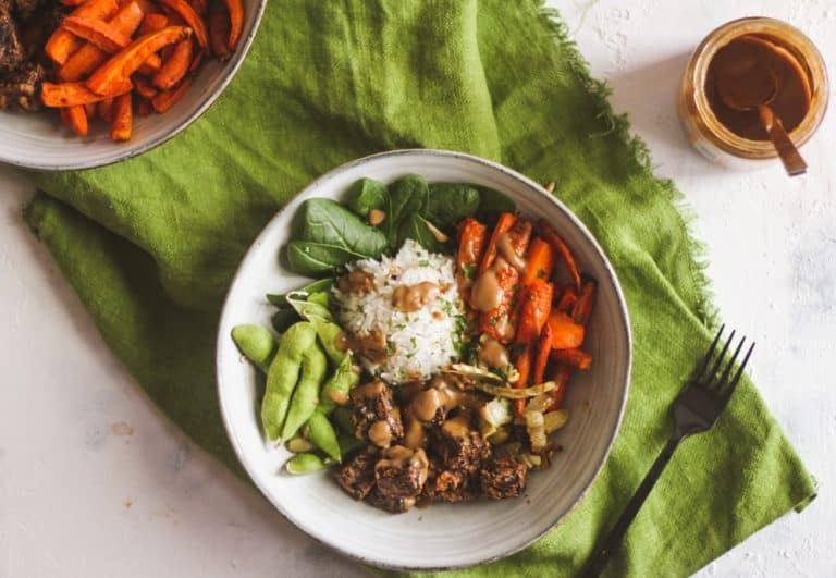 Für Ausgewogene und Rotfleisch Typen ist es perfekt, wenn statt dem Tempeh marinierte Rinderstreifen verwendet und diese in der Pfanne gebraten werden. Am Ende noch einen großzügigen Schuss Erdnussöl auf der Bowl verteilen.